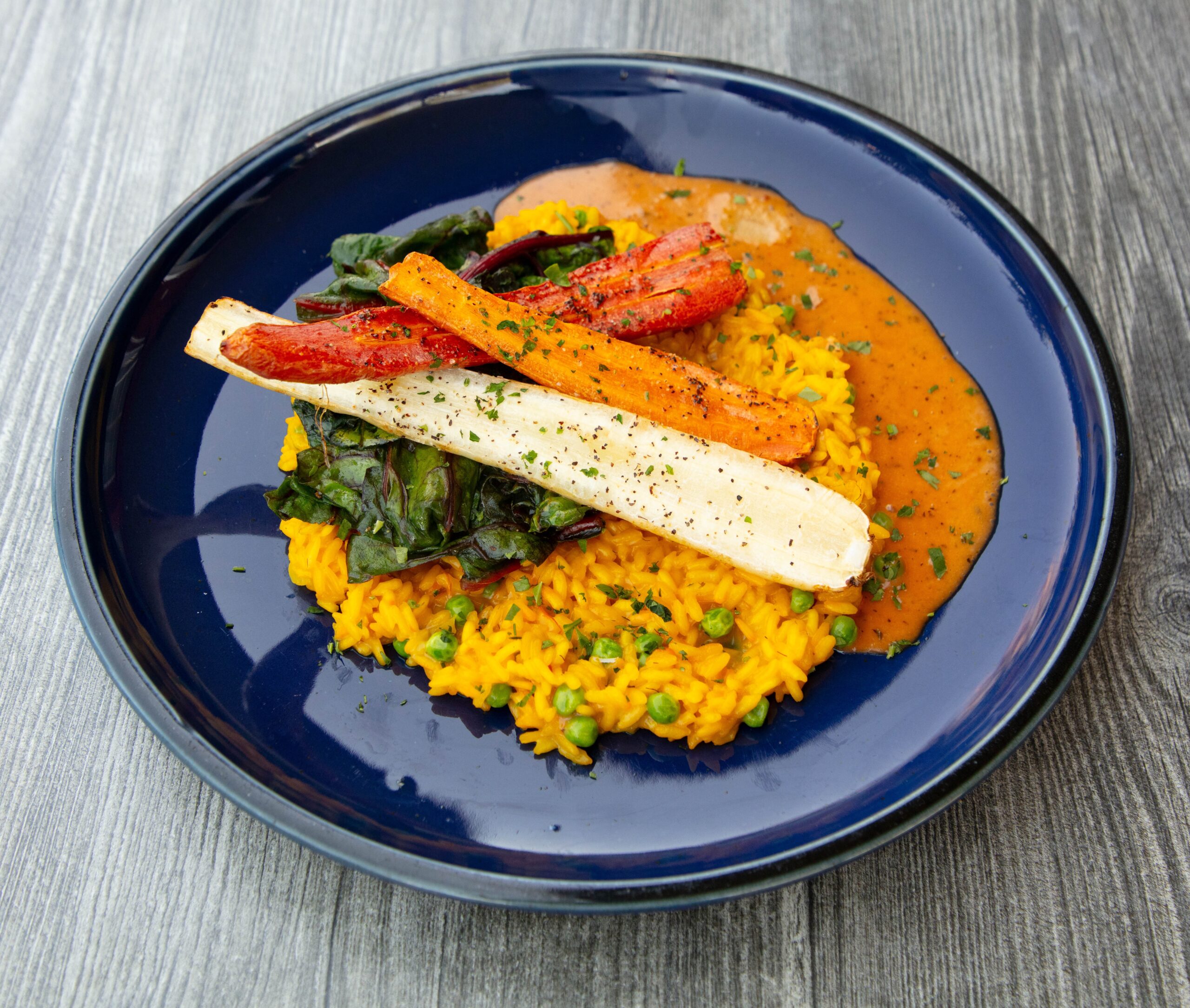 Braised rainbow Swiss chard, saffron risotto, peas, and charred carrot...