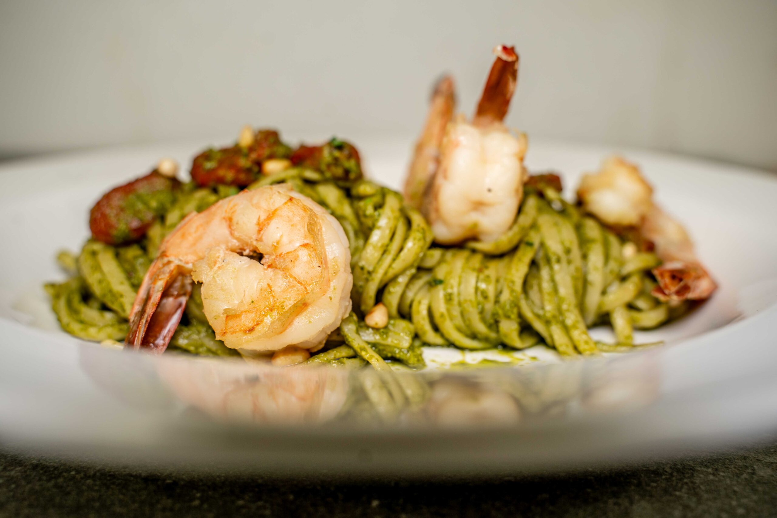 Imported “guitar string” pasta, Sea of Cortez shrimp, basil pesto,...