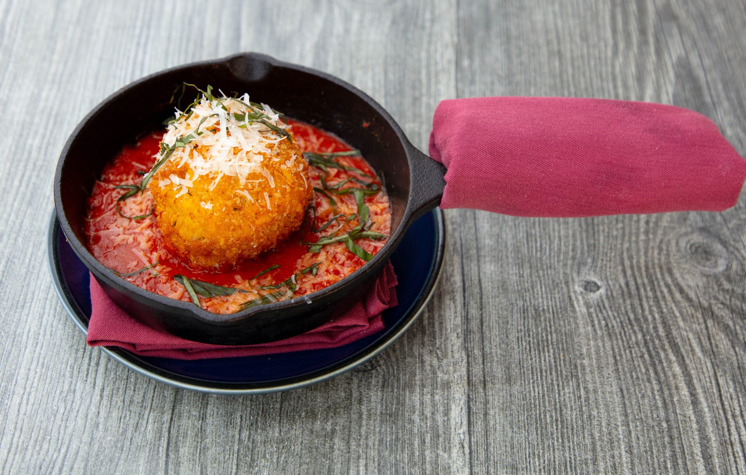 Saffron carnaroli rice ball that is stuffed with pomodoro sauce, peas, cheese, coated with breadcrumbs and deep fried