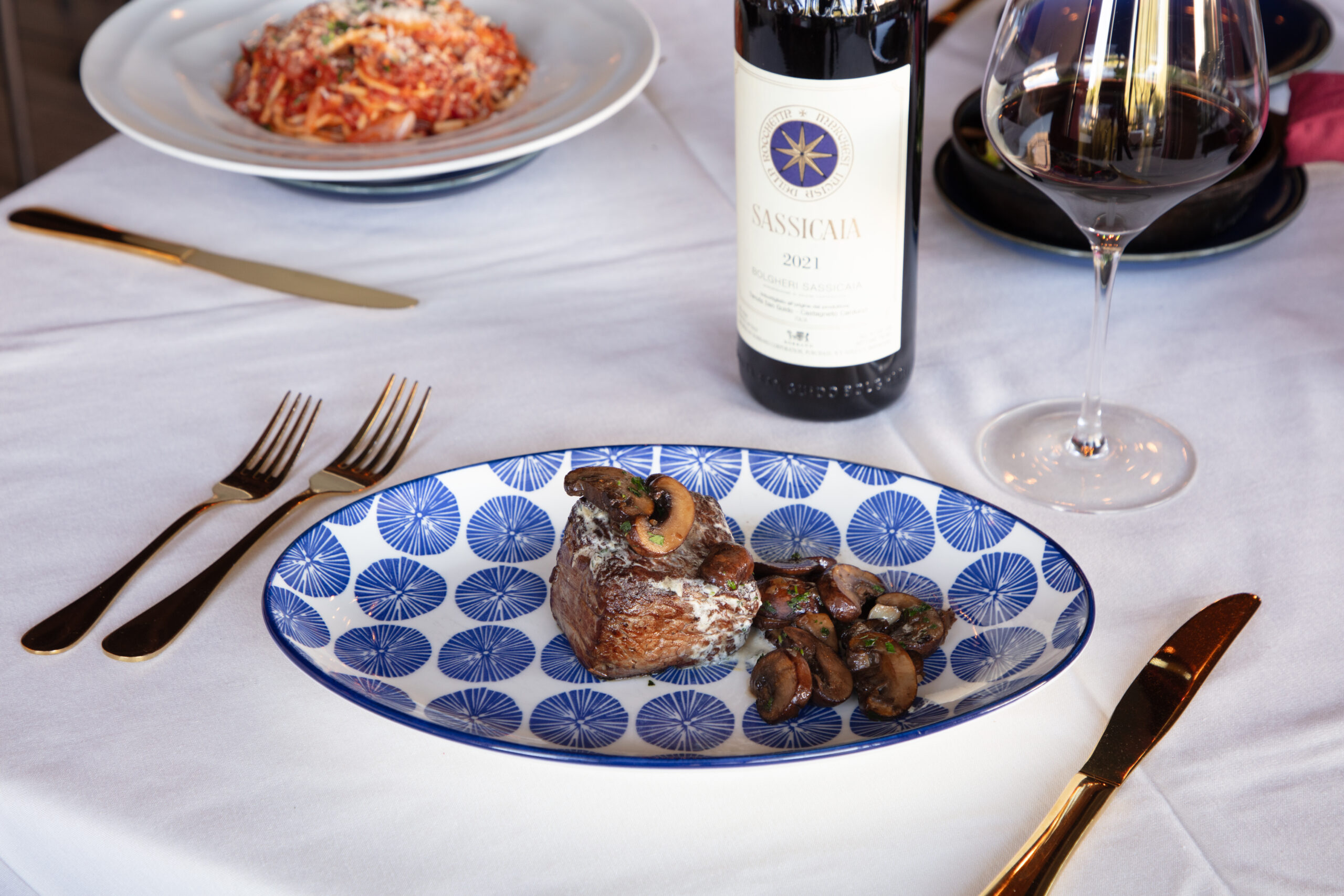 8oz center cut wood fire grilled steak, Barolo wine sauce, arugula salad garnish